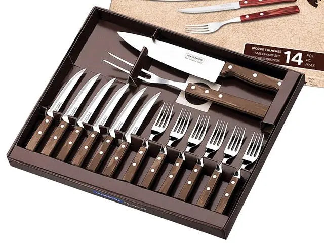 Conjunto para churrasco 14 peças. Facas com lâminas de maior durabilidade do fio devido ao tratamento térmico, e garfos cuja espessura do aço e a estampagem das lâminas garantem maior resistência aos produtos, evitando deformações, e cabos de madeira com tratamento especial, oferecendo maior durabilidade às peças. São peças resistentes a impactos e a altas temperaturas, que podem ir à máquina de lavar louças e que permanecem bonitas por muito mais tempo.